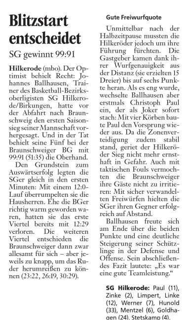 Doch anders als im vergangenen Spiel stimmte am Samstag die Einstellung und die verwandelten Freiwürfe in den letzten Minuten, welche die Braunschweiger in kontrollierbarem Abstand hielten, sicherten letztendlich den ersten Auswärtssieg der Saison. Aus einer geschlossenen starken Mannschaftsleistung ist der Topscorer Josef Hunold herauszuheben, der ein überragendes Spiel ablieferte und seine Mannschaft zum verdienten Sieg führte.