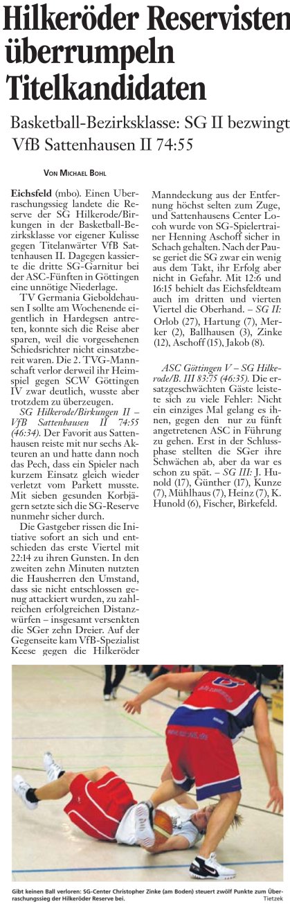 Die SG Hilkerode / Birkungen II hat in der Bezirksklasse überraschend den Titelanwärter VFB Sattenhausen II mit 74 : 55 geschlagen.